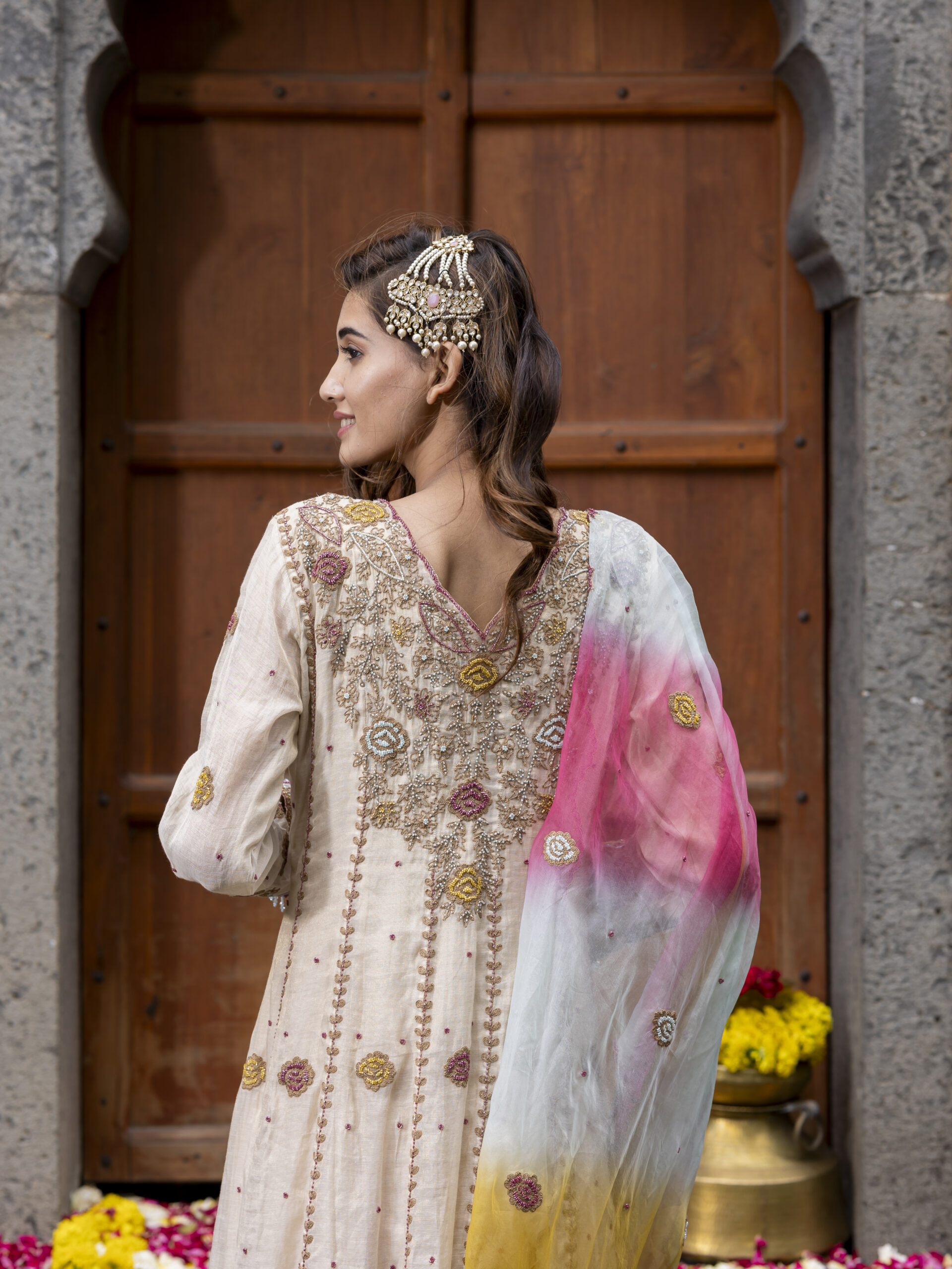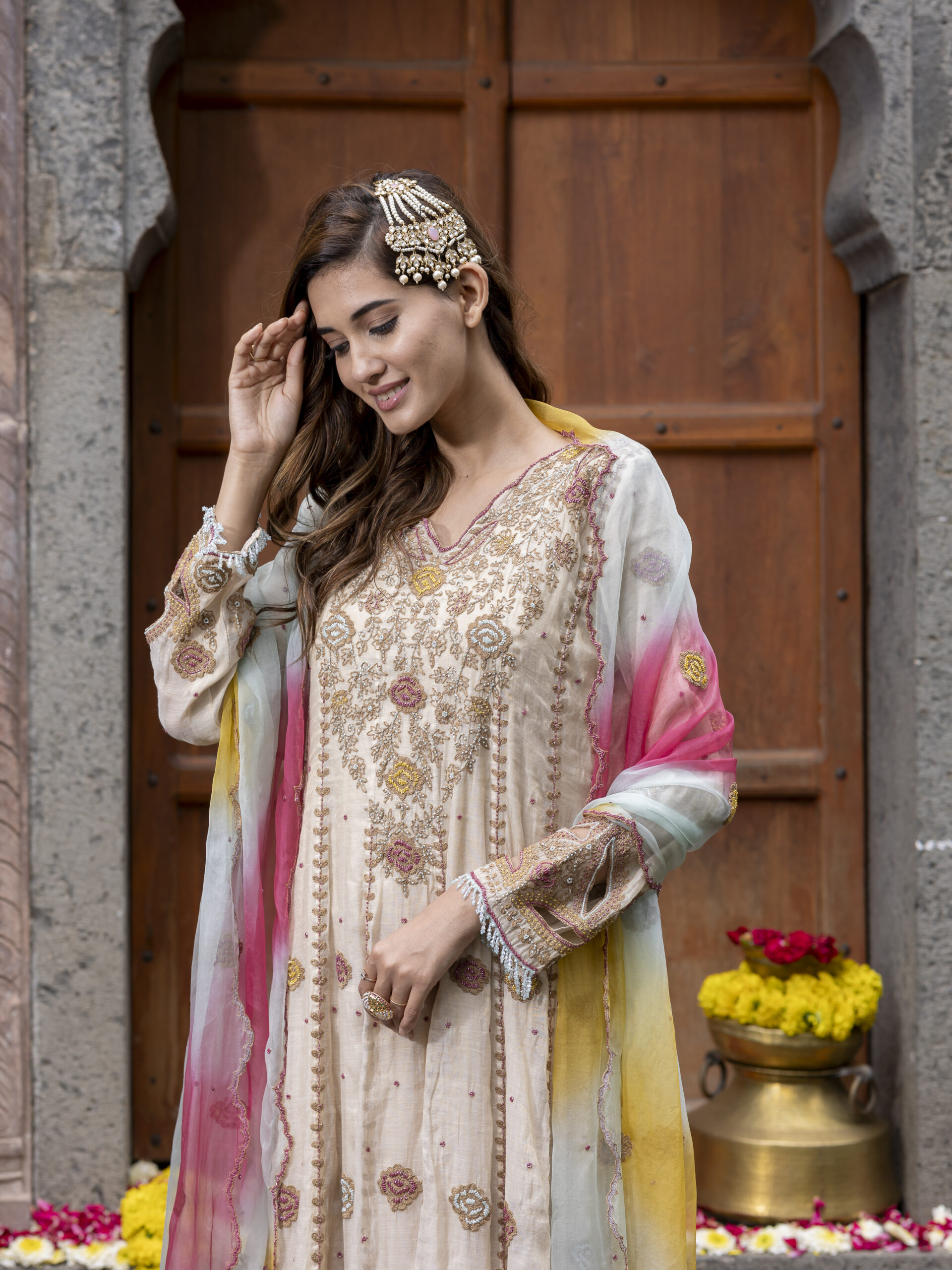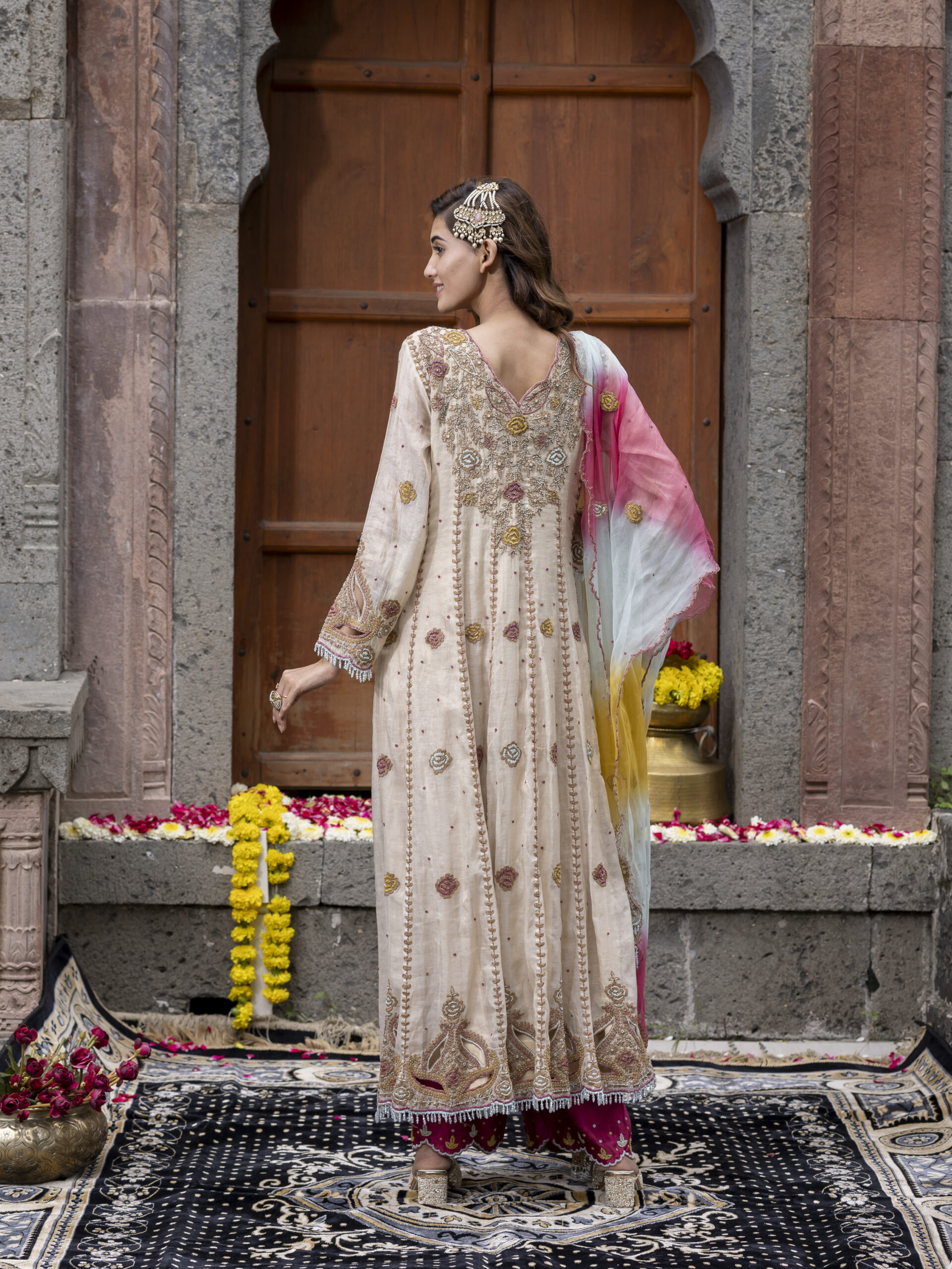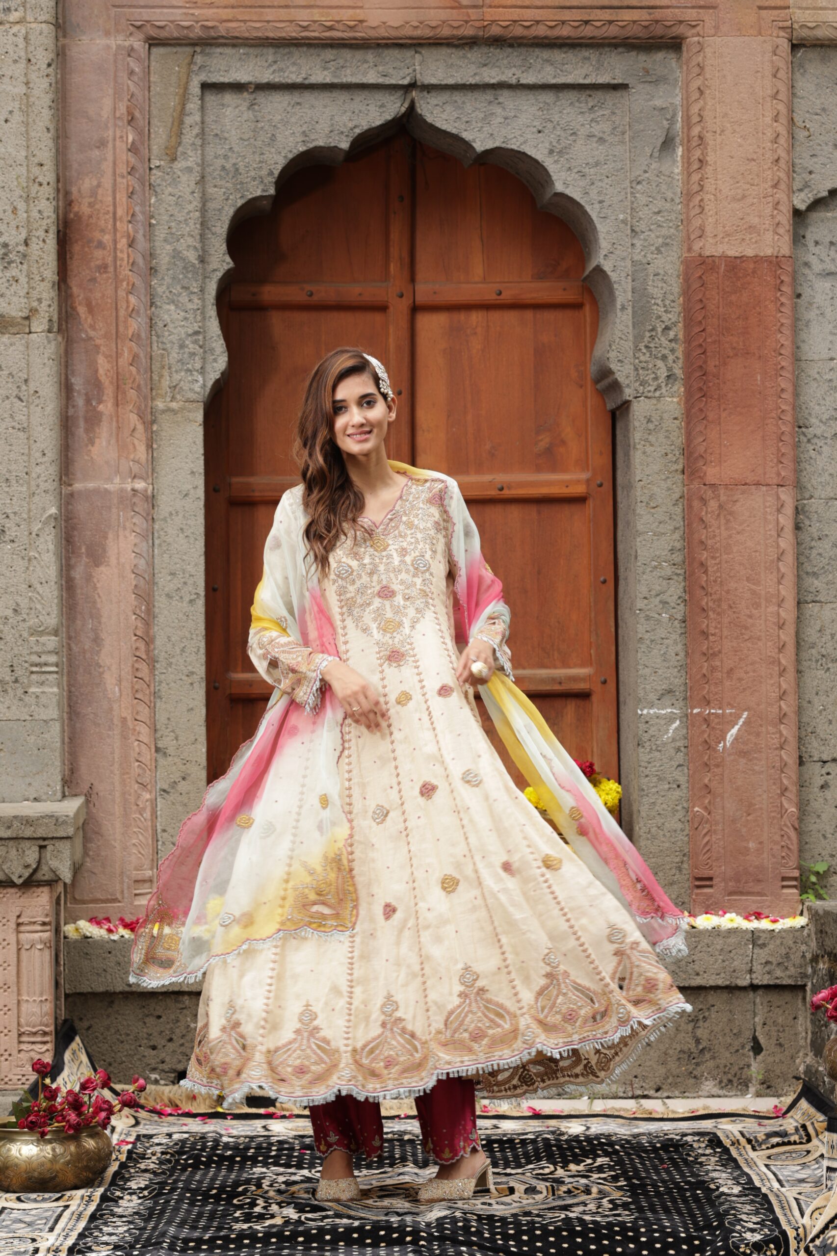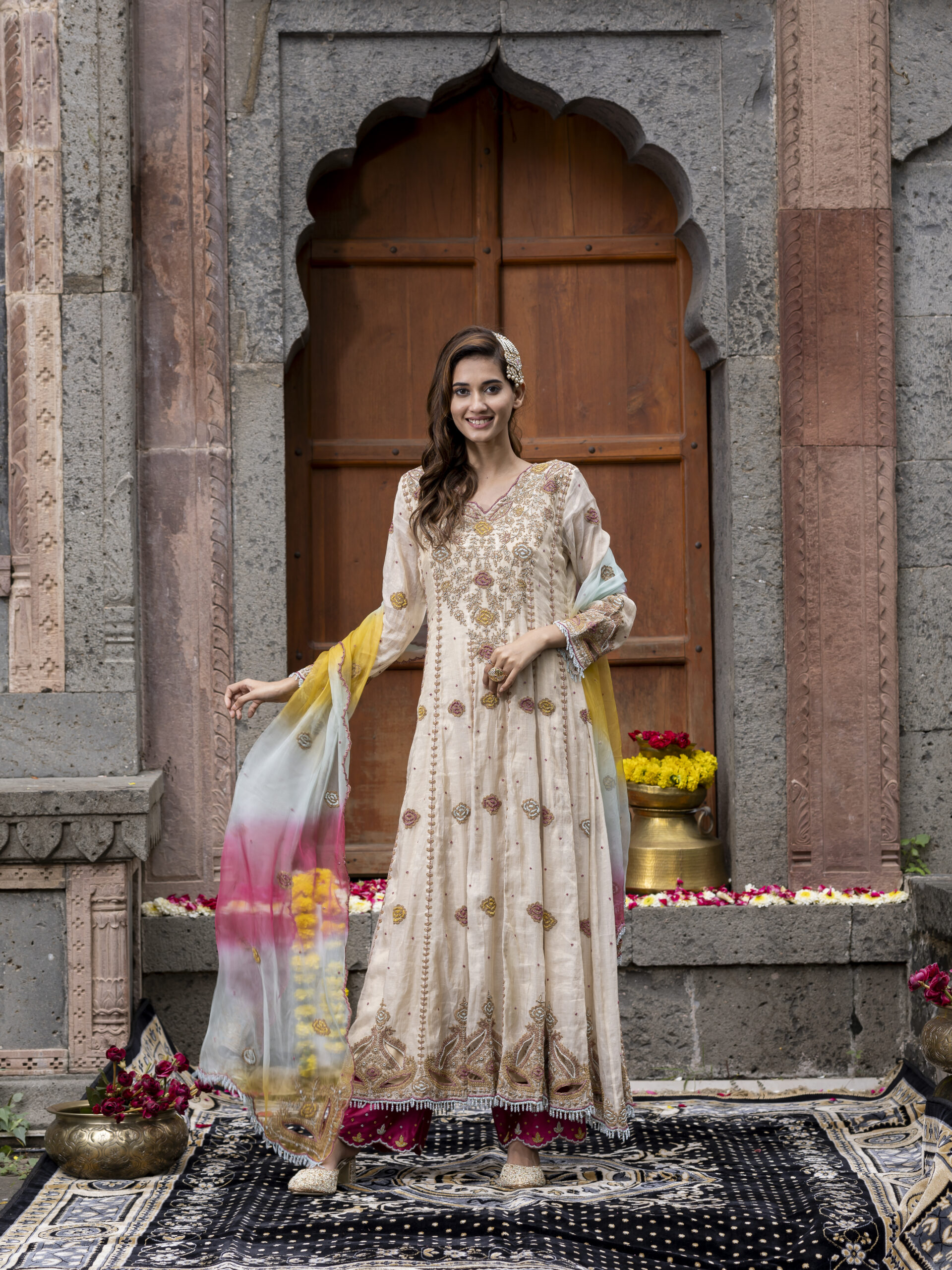 Material used – chanderi silk tissue for anarkali,gajji mushru silk for plazo pants,pure organza for dupatta, Hand embroidery of cutdana,dori and cutwork