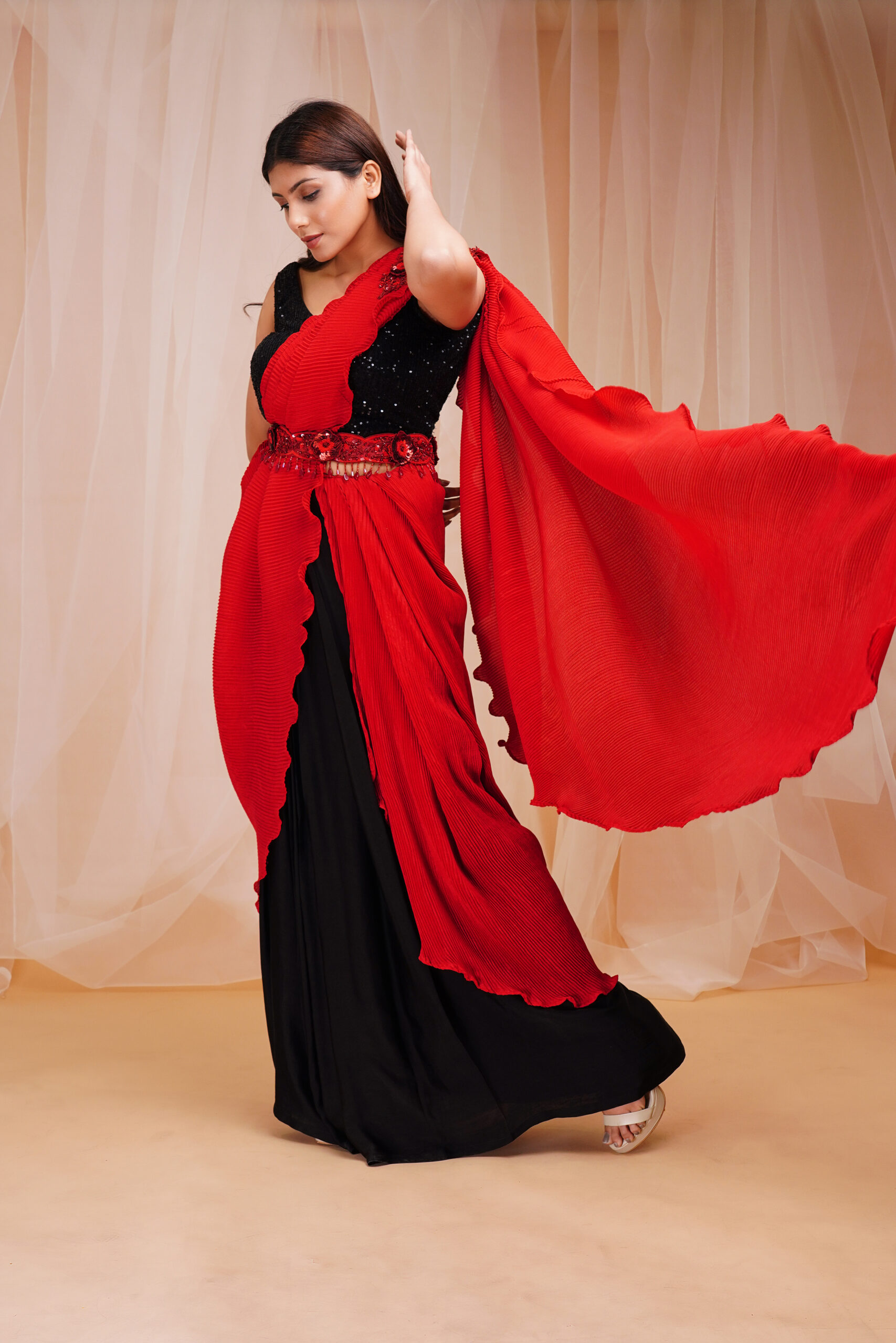 3 piece ready to wear drape saree ,sequins material blouse,hand embroidered belt and saree,pleated and gajji modal satin used as a material