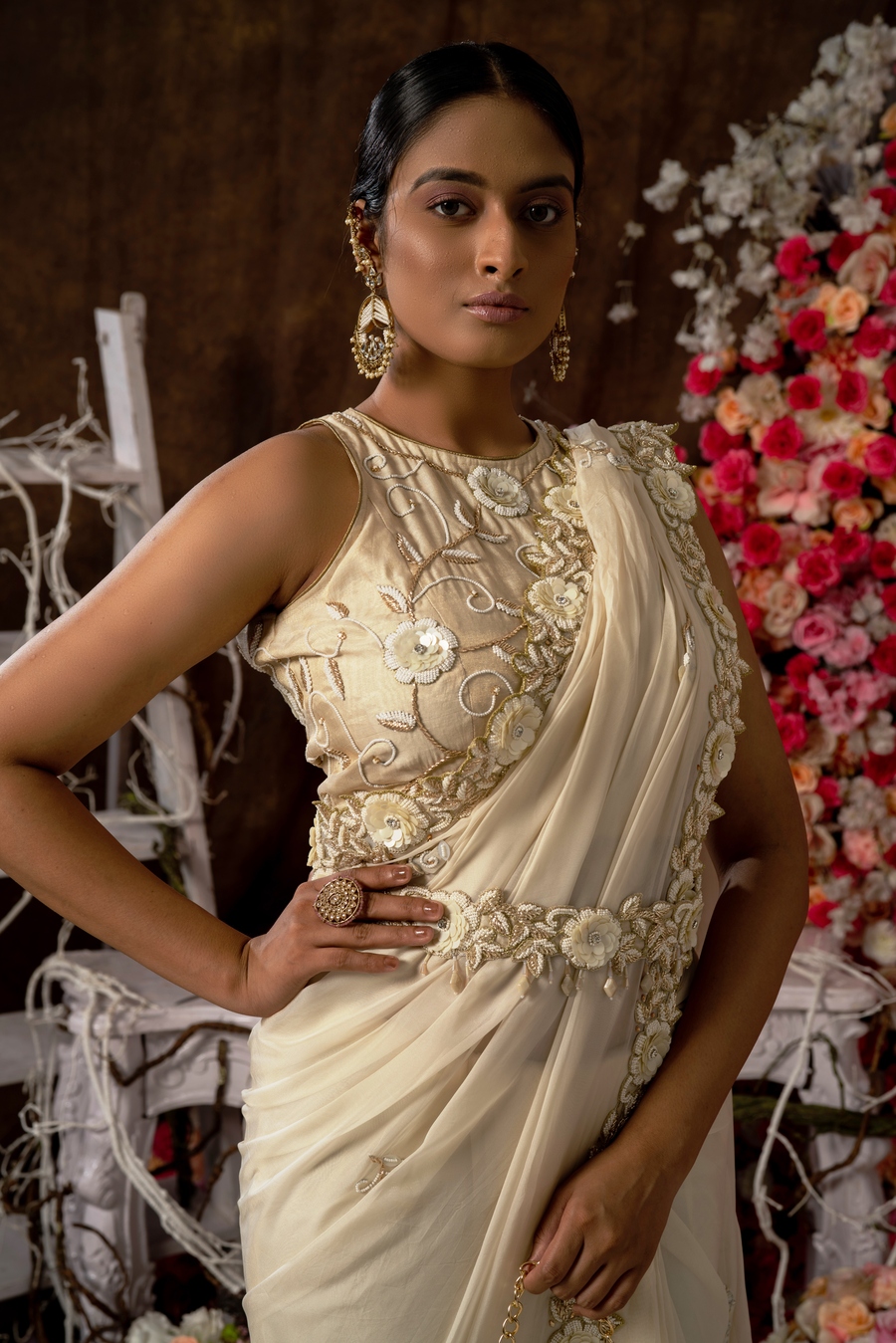 Main colour of the product (NOTE: Colours can be customised if required so) – ivory for saree
