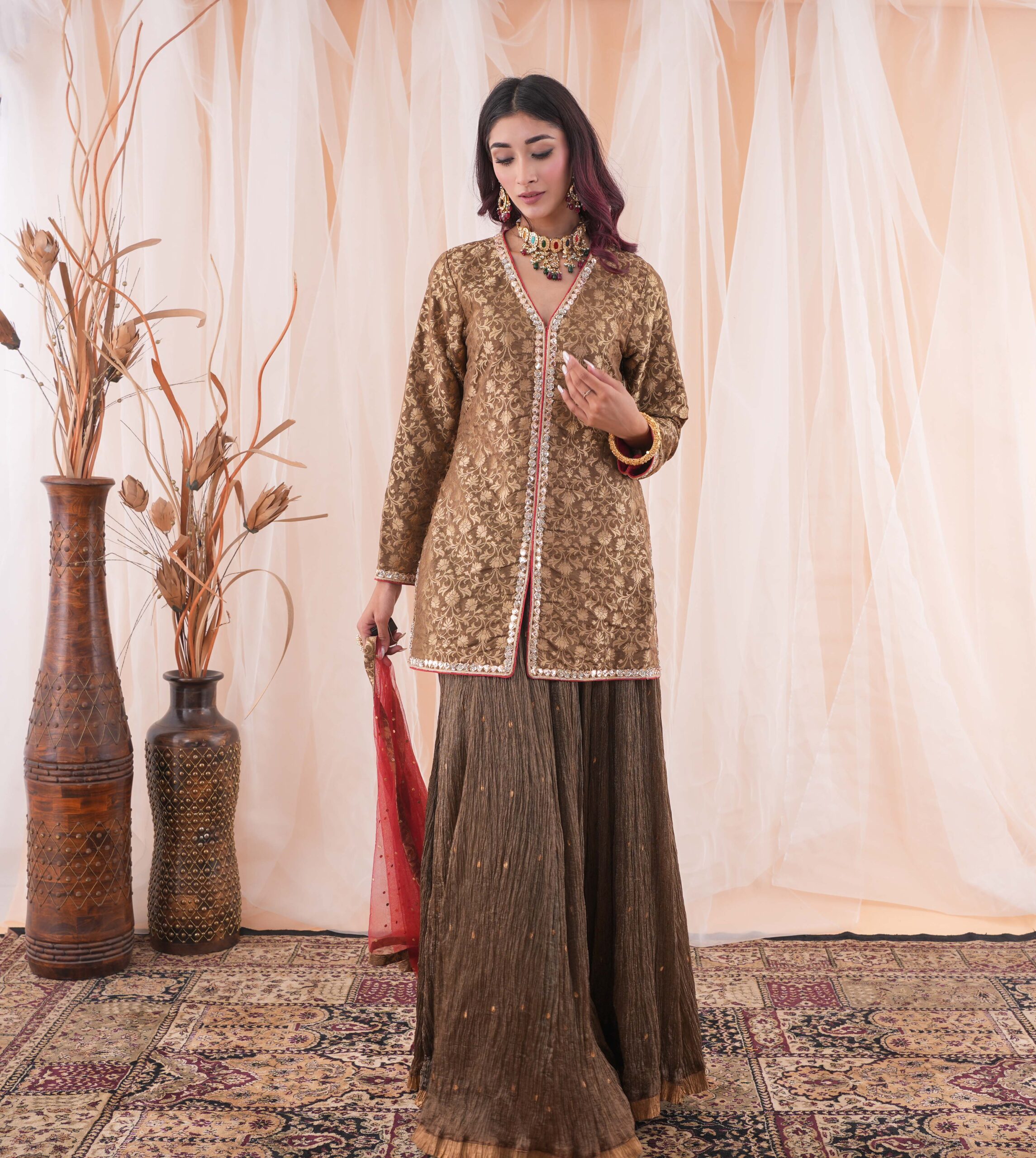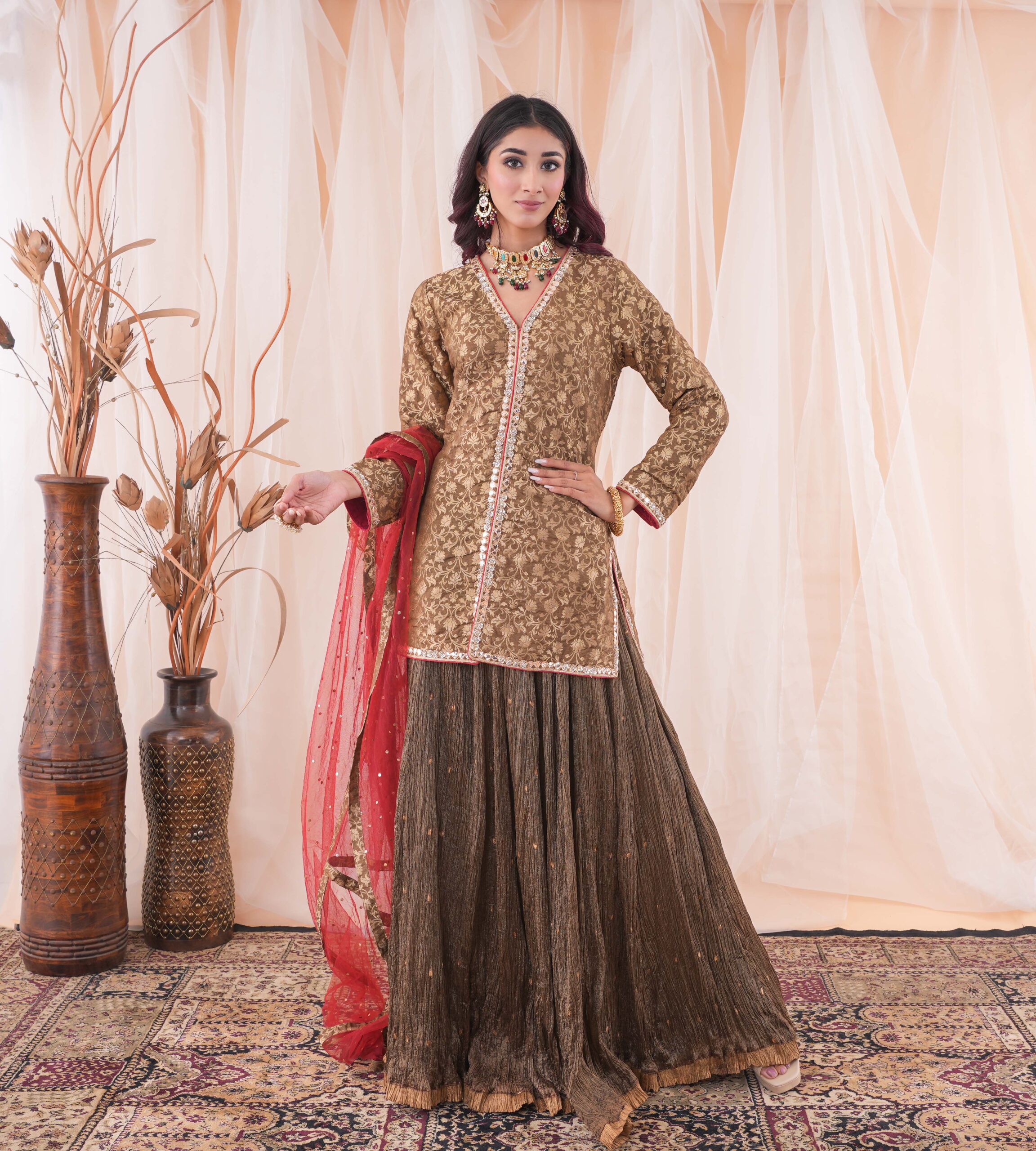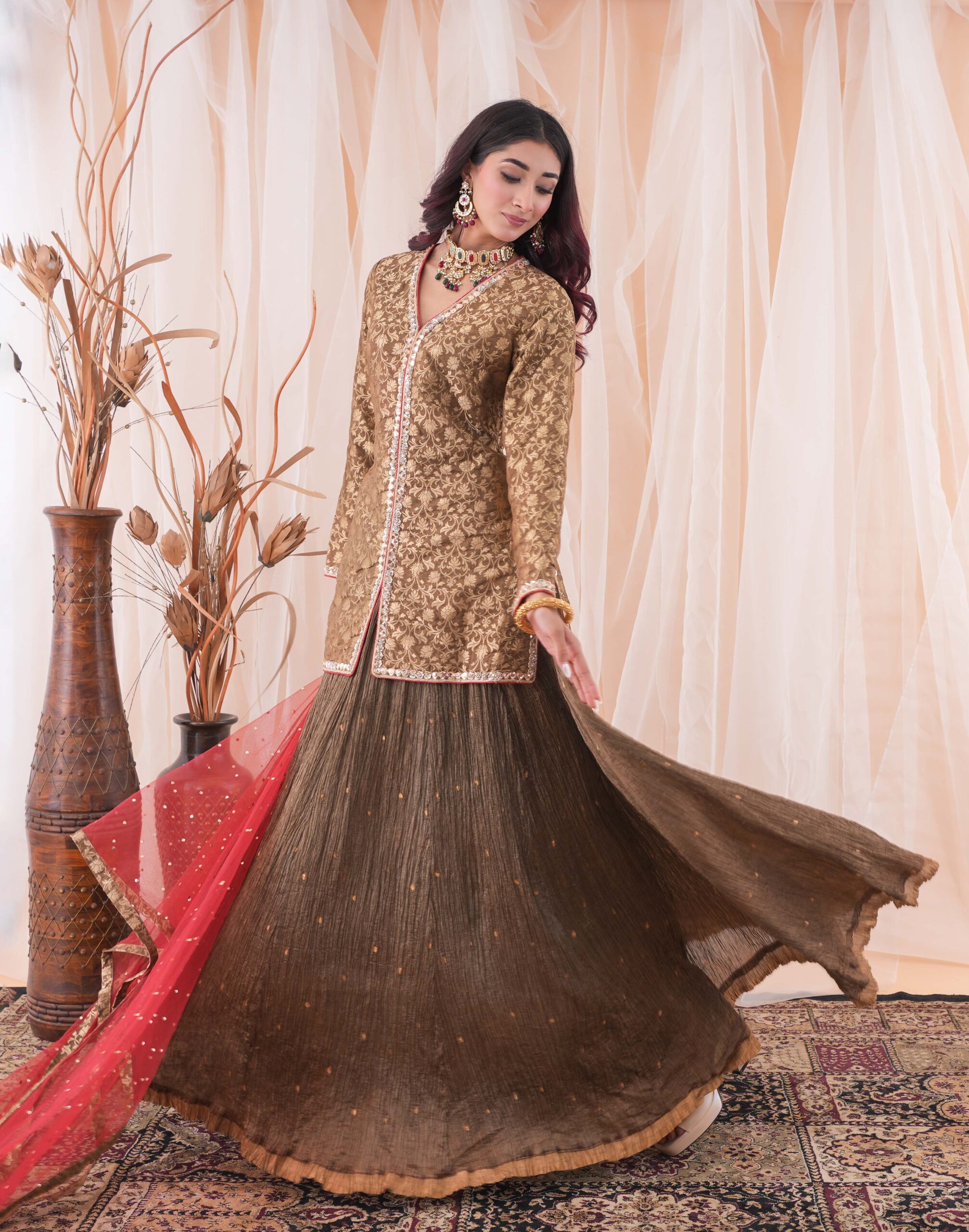 Material used- Banarasi Brocade For Kurta, Crushed Silk For Skirt And Net For Dupatta, Hand Embroidery Of Pitta And Mukesh On Kurta And Dupatta And Block Printing On Skirt