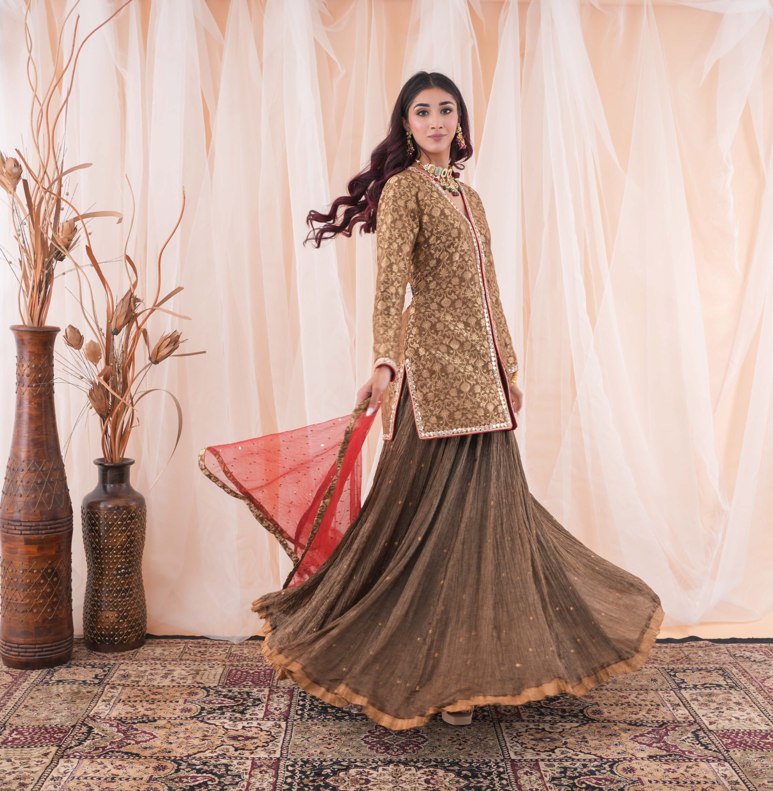Main colour of the product (NOTE: Colours can be customised if required so)- Dark Olive Green for for Kurta and Skirt and Crimson Red for Dupatta